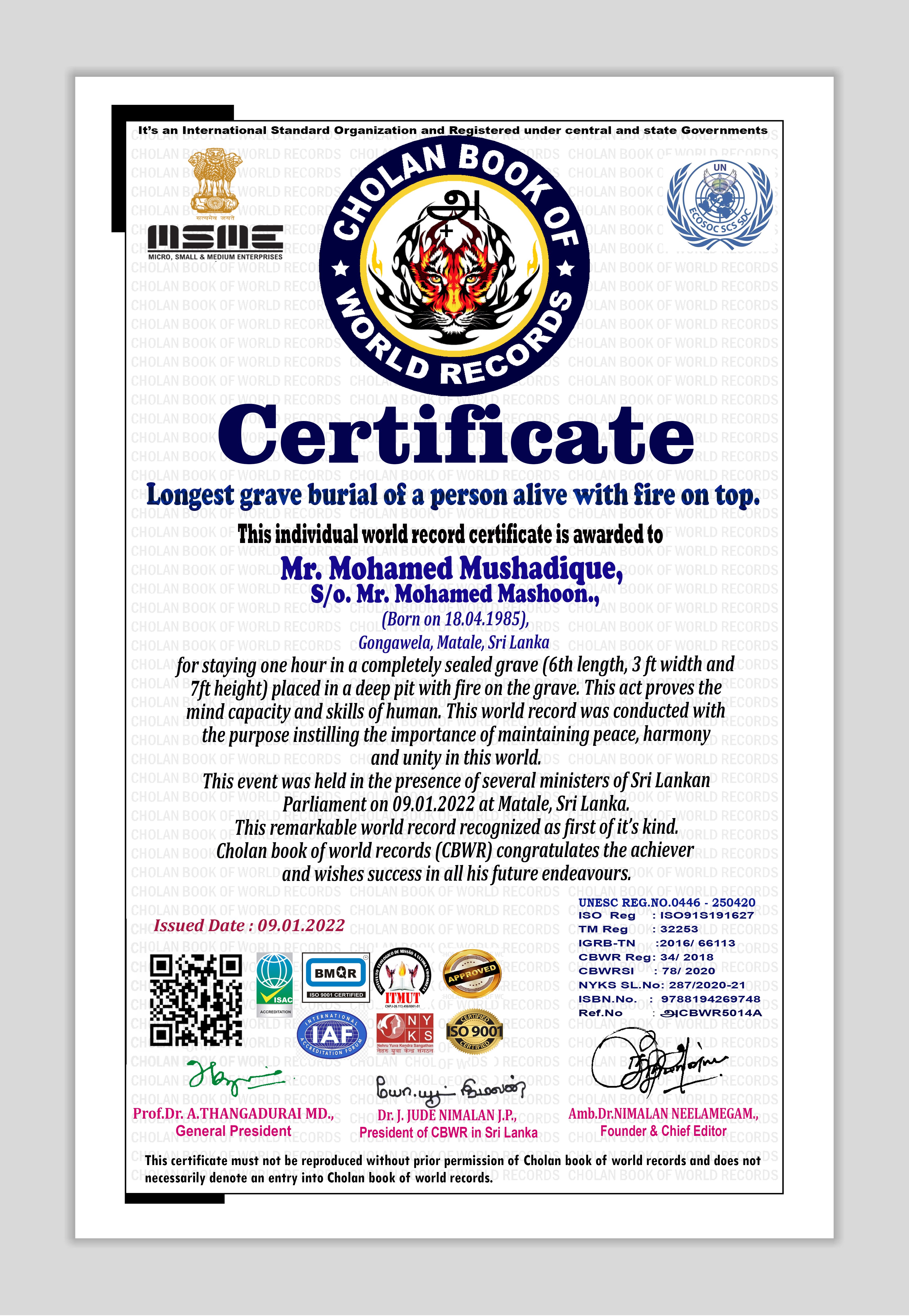 மூடிய குழிக்கு மேல் தீ மூட்டப்பட்ட நிலையில் 1 மணிநேரம் சுவாசத்தீற்கு காற்று கிடைக்காமல், தியான வலிமையினால் இந்த உலக சாதனையை சாத்தியமாக்கியுள்ளார் இலங்கையின் மாத்தளையைச் சேர்ந்த திரு. மொஹமட் முசாதிக் அவர்கள்.