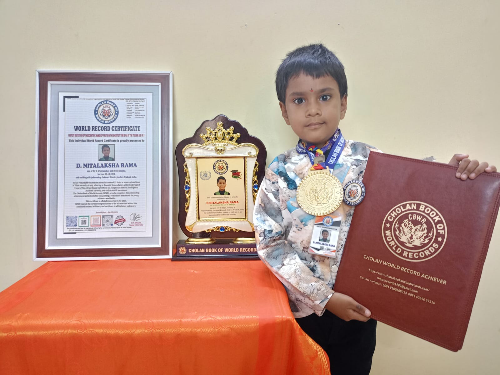 He has remarkably recited the scientific names of 25 fruits in an exceptional time of 50.66 seconds, strictly adhering to Binomial Nomenclature, at the tender age of 5 years. This extraordinary feat reflects her exceptional memory, intelligence, academic curiosity, and early scientific awareness.