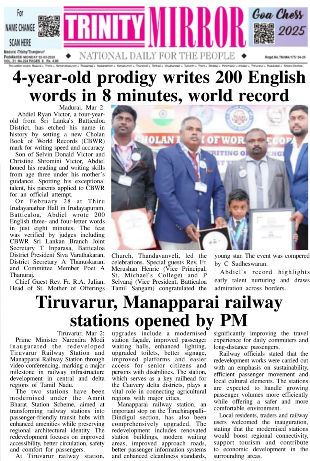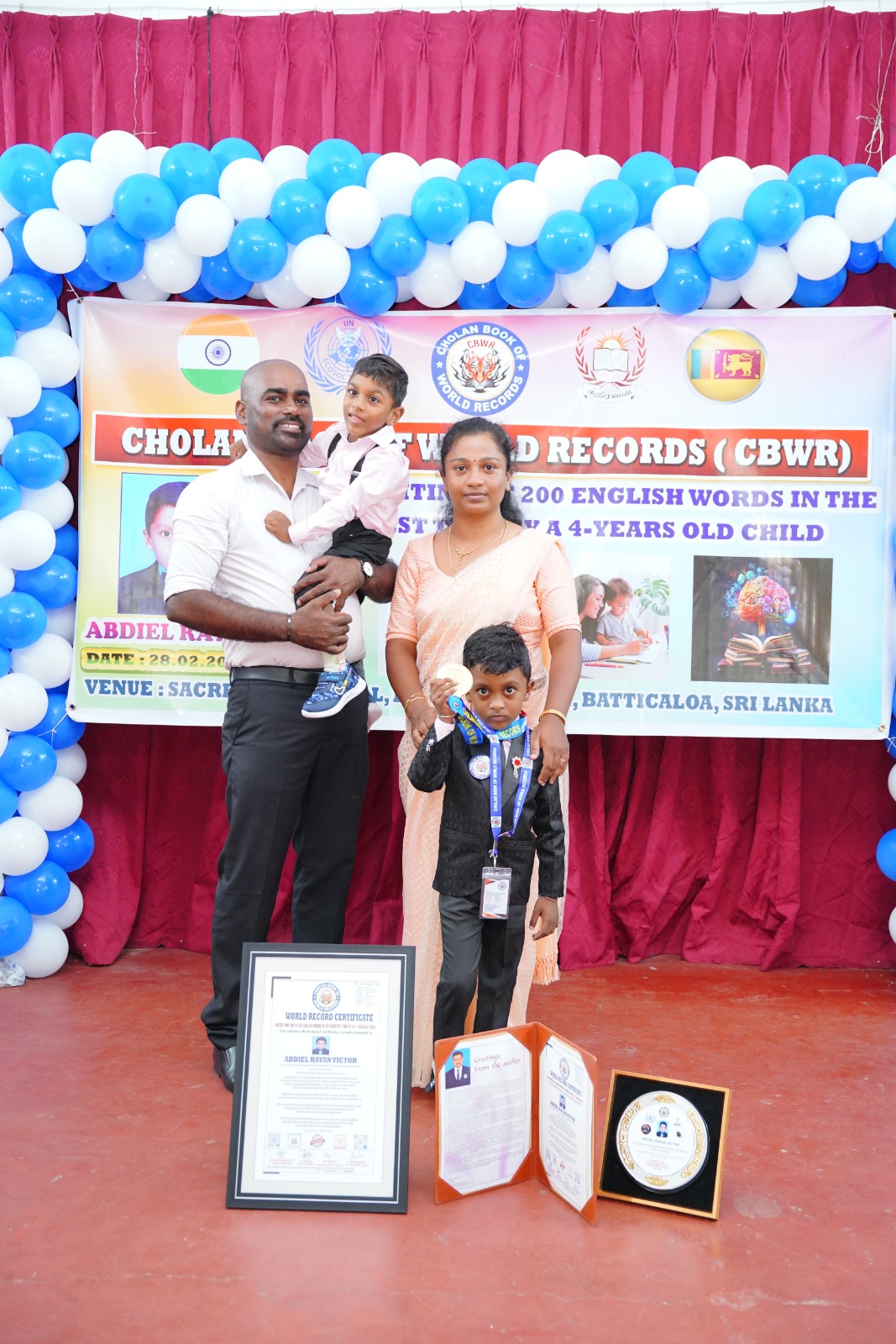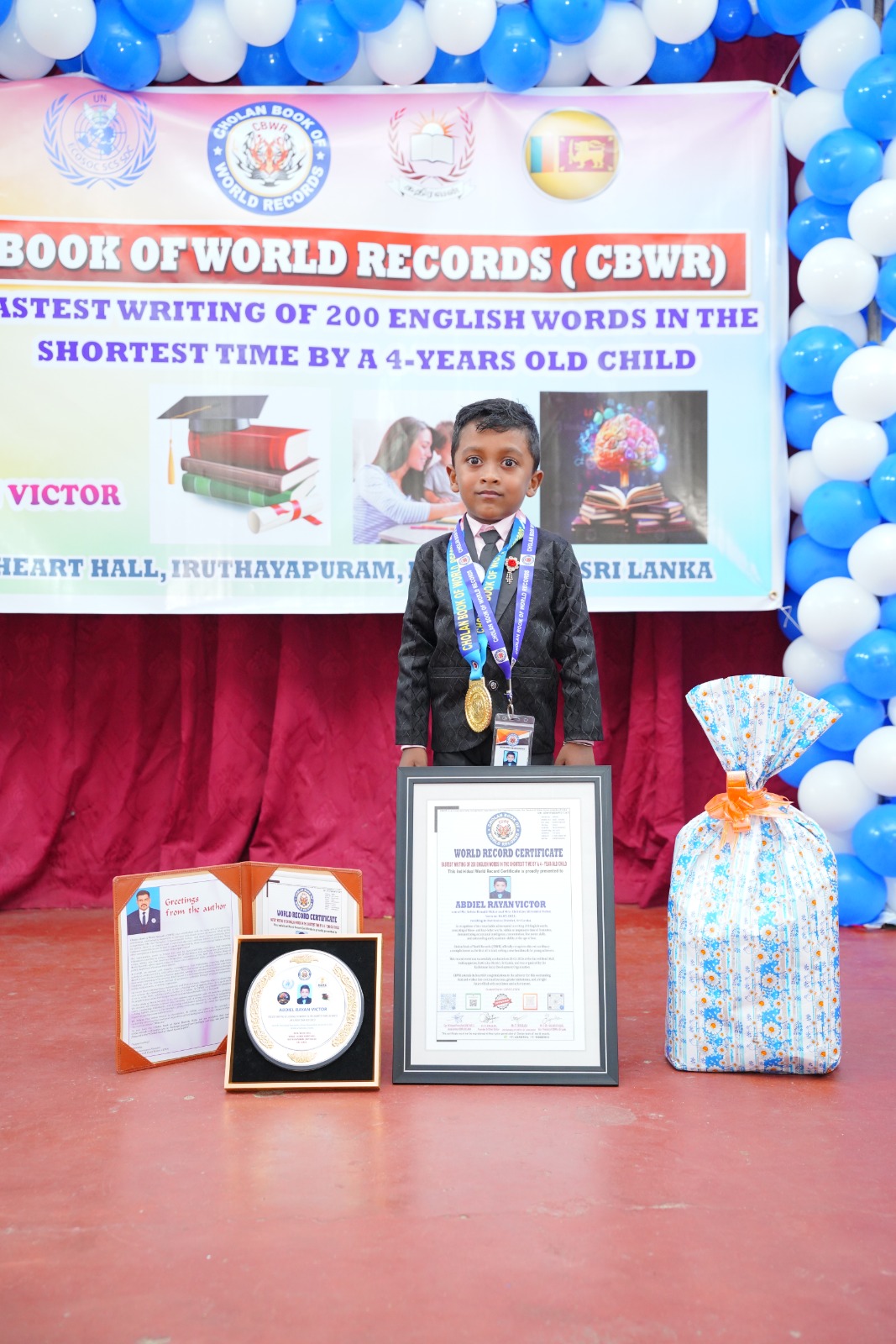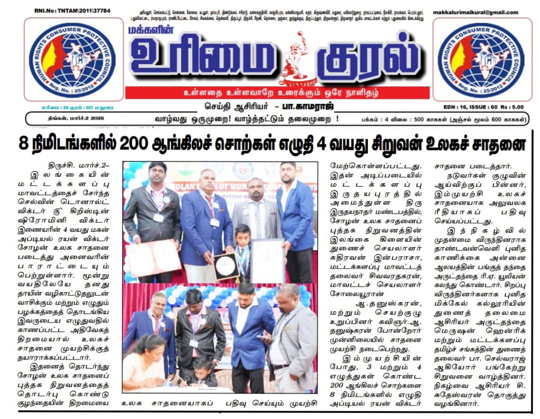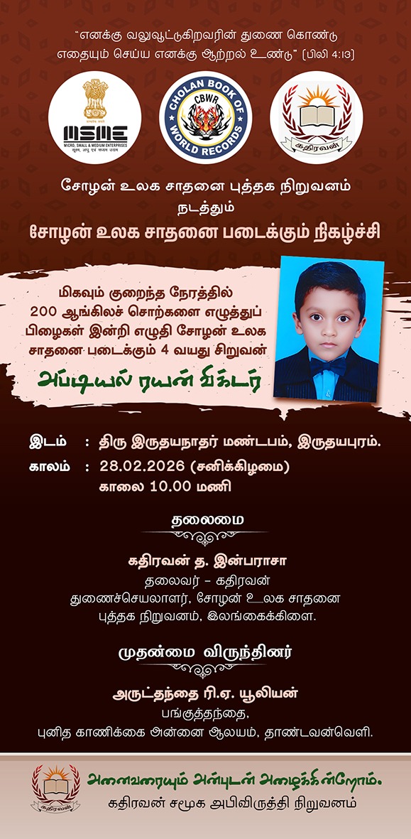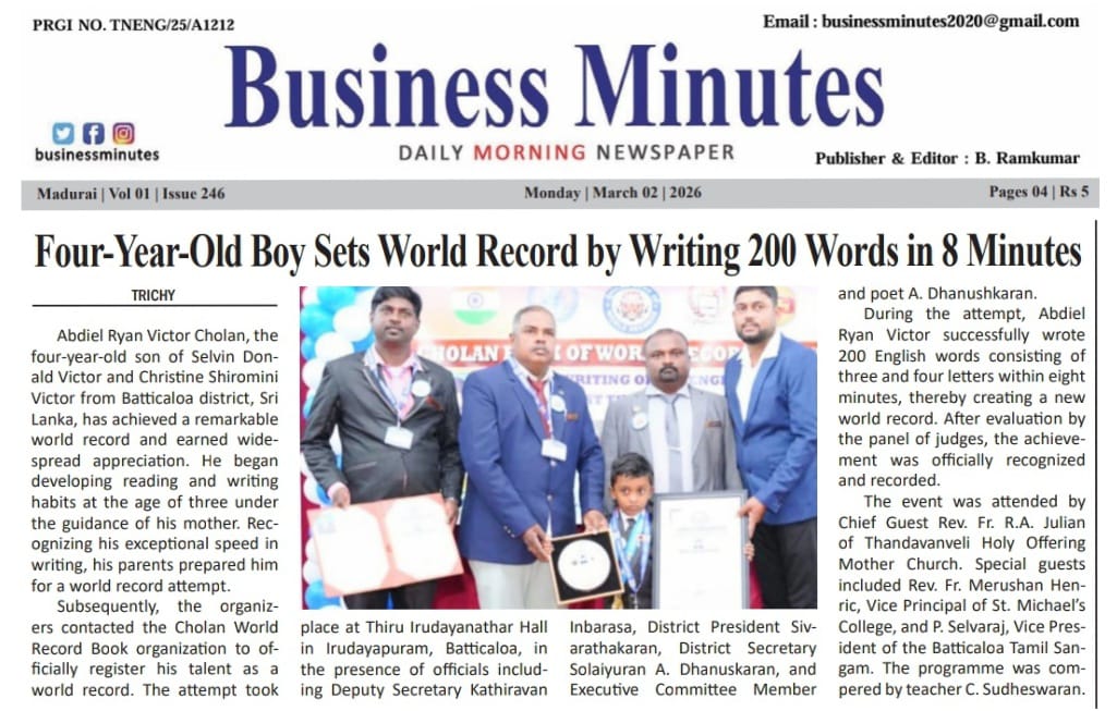 During the attempt, Abdiel Ryan Victor successfully wrote 200 English words, each consisting of three and four letters, within just eight minutes, thereby setting a new Cholan World Record. Following a thorough evaluation by the panel of judges, the achievement was officially confirmed and registered as a world record.