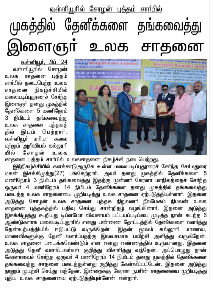 The Cholan Book of World Records formally recognizes this milestone accomplishment and records it with honor in its archives of distinguished world achievers.