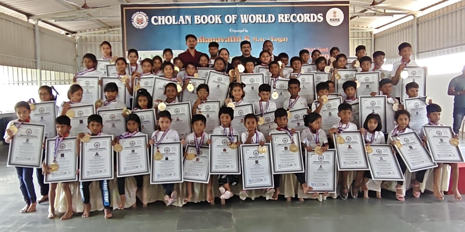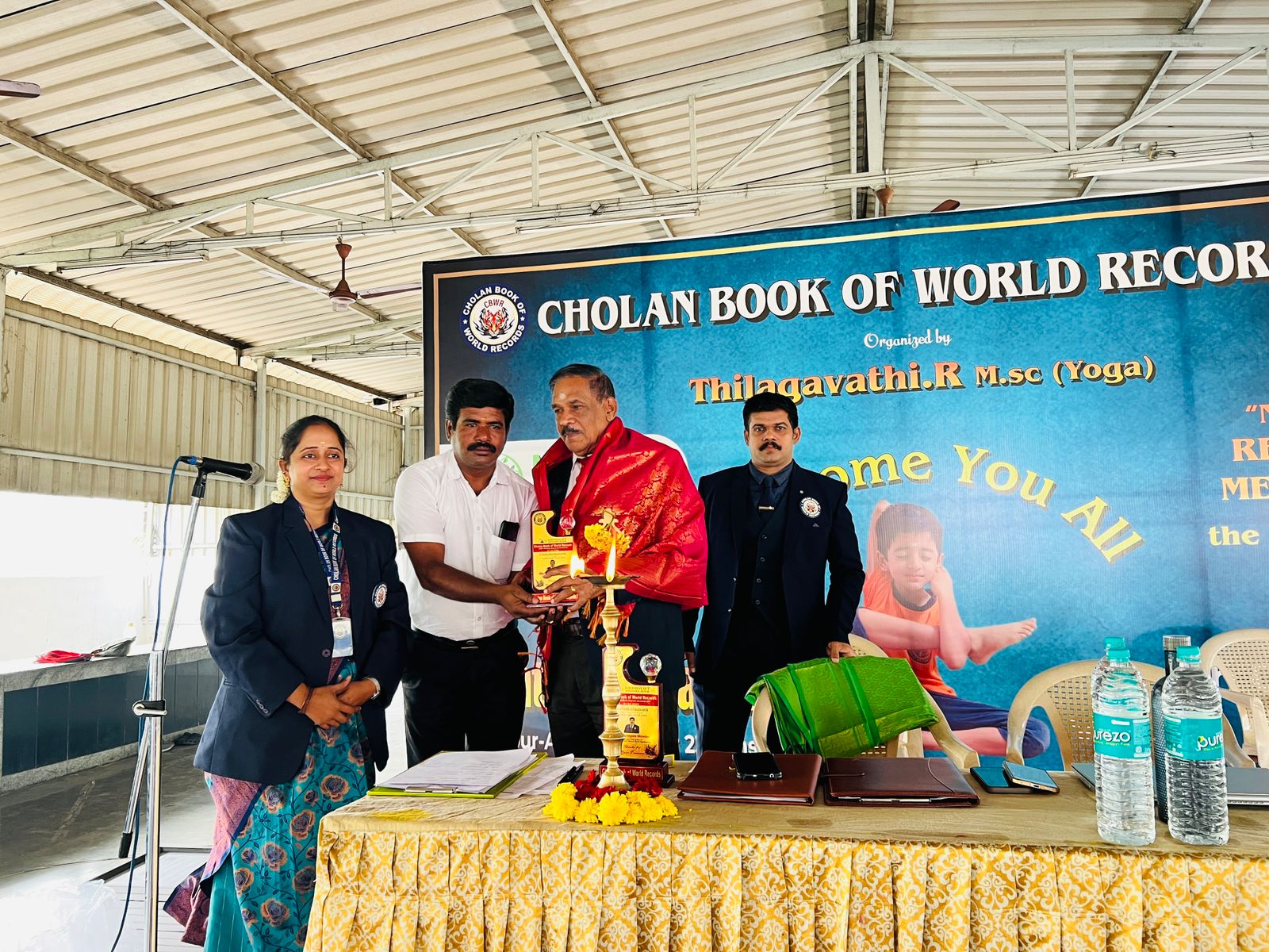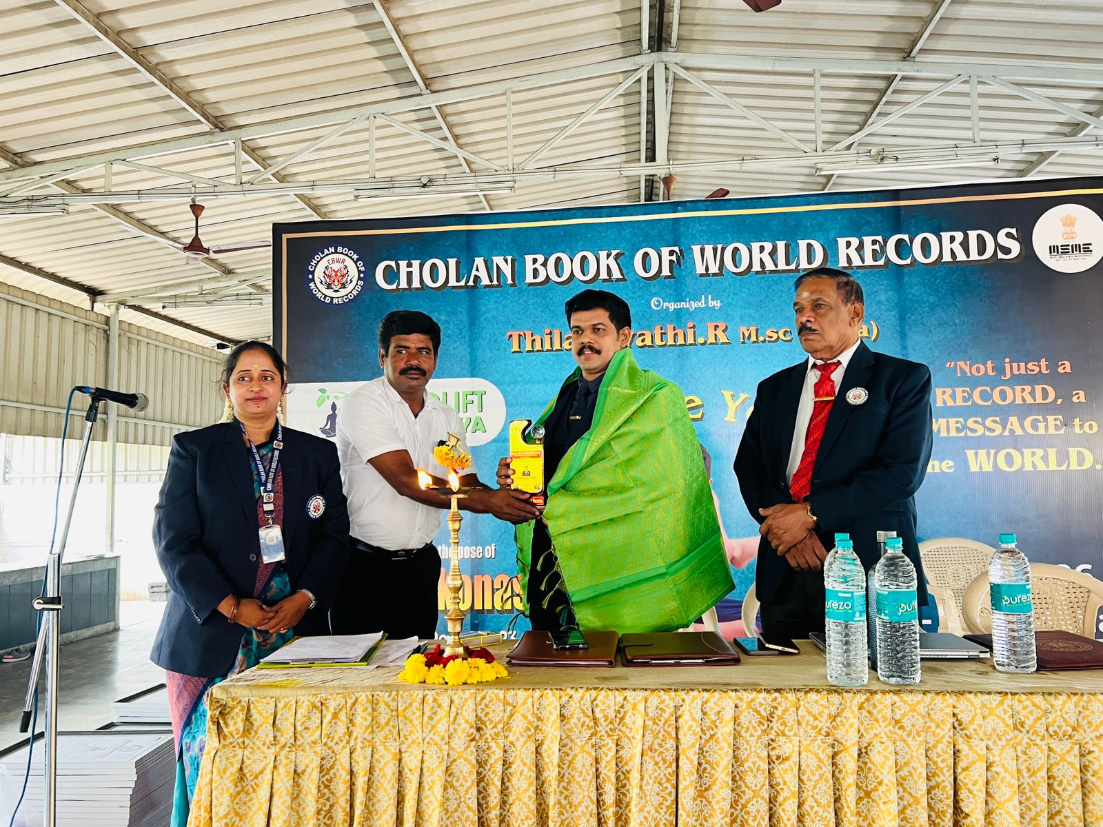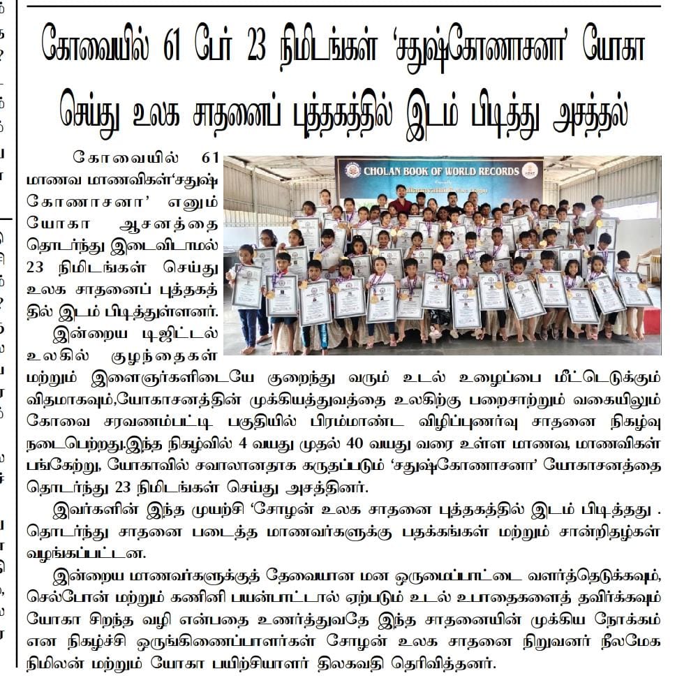 This historic achievement has been officially recognized by the Cholan Book of World Records (CBWR) as the first record of its kind, establishing a new benchmark in the field of yoga accomplishments.