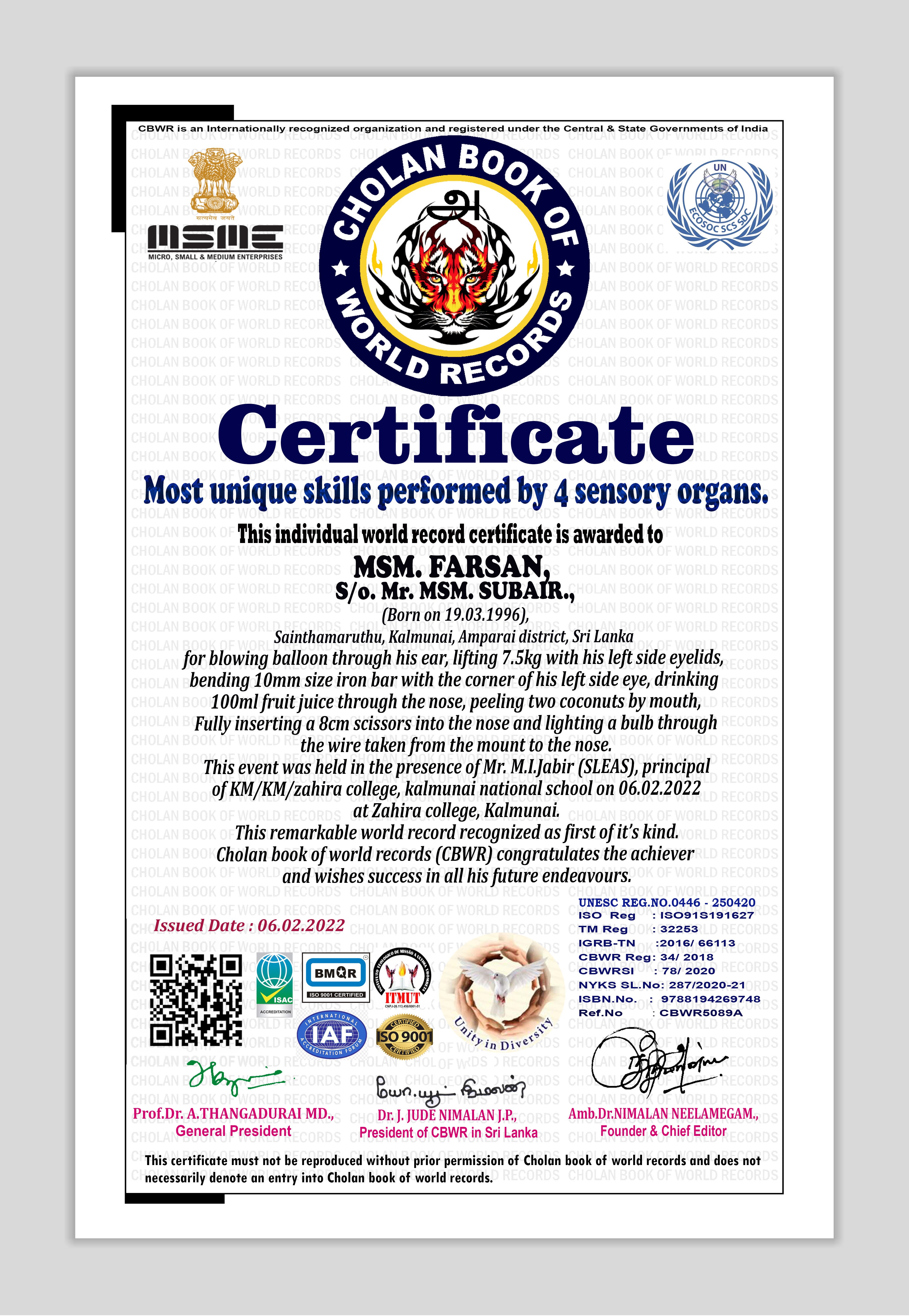Cholan book of world records (CBWR) congratulates the achiever and wishes success in all his future endeavours