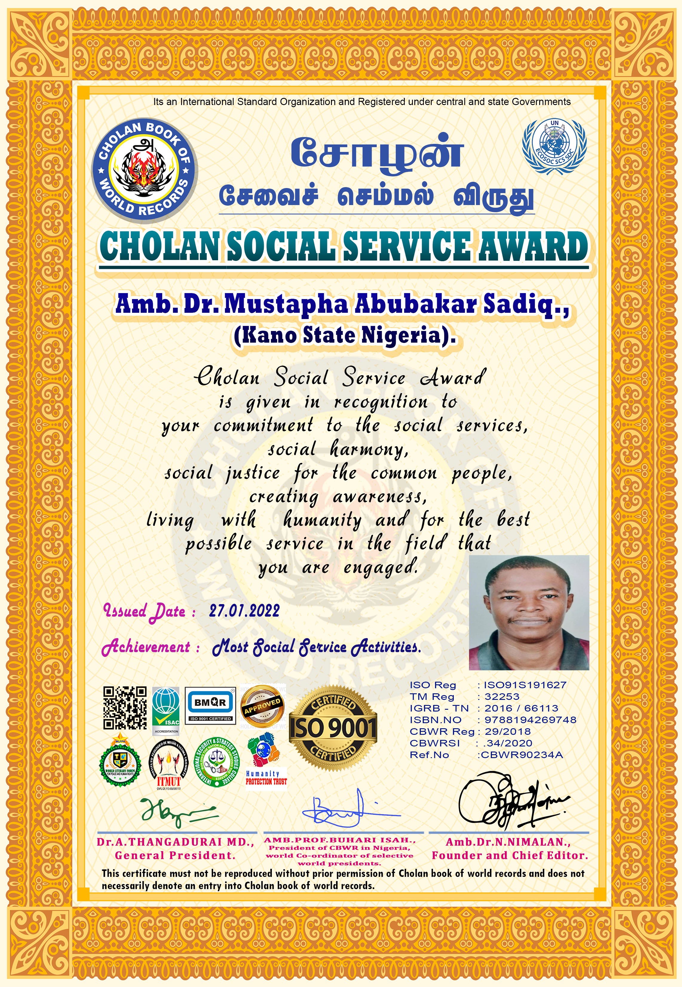 Amb.Dr.Abubakar Sadiq Mustapha WRH Kano State Nigeria,breaks the record of Cholan Book of World Record as Cholan Social Services Award in the year 2022.You are given this world record based on your contribution to humanities,life for the sake of others,respect of human kinds,helping weaker people in the society,creating awareness to the peaceful co-existence,social harmony,social justice for the common people,living with humanity and for the best possible service in the field that you are engaged.