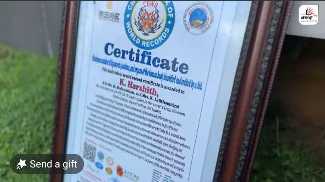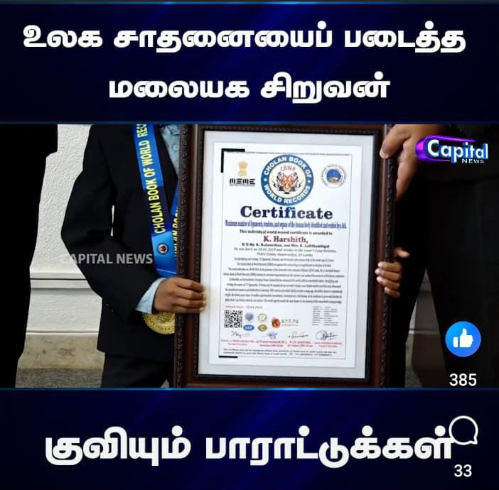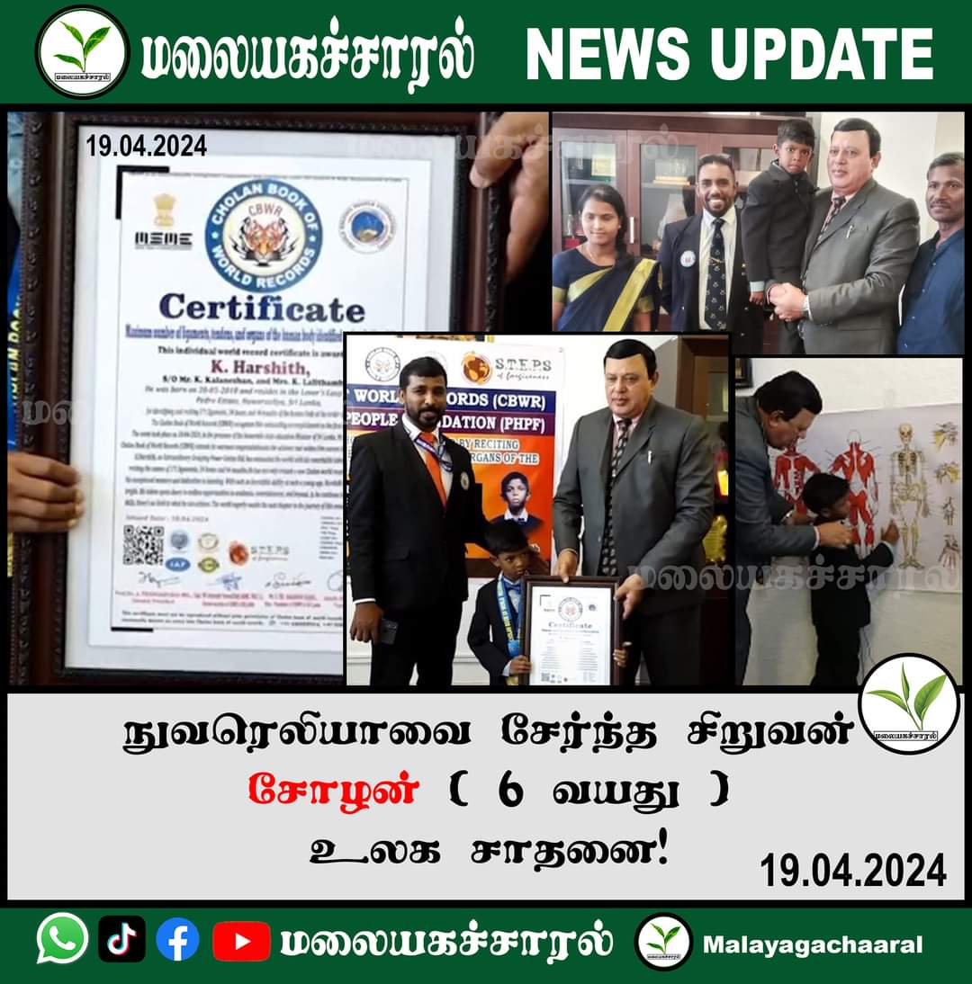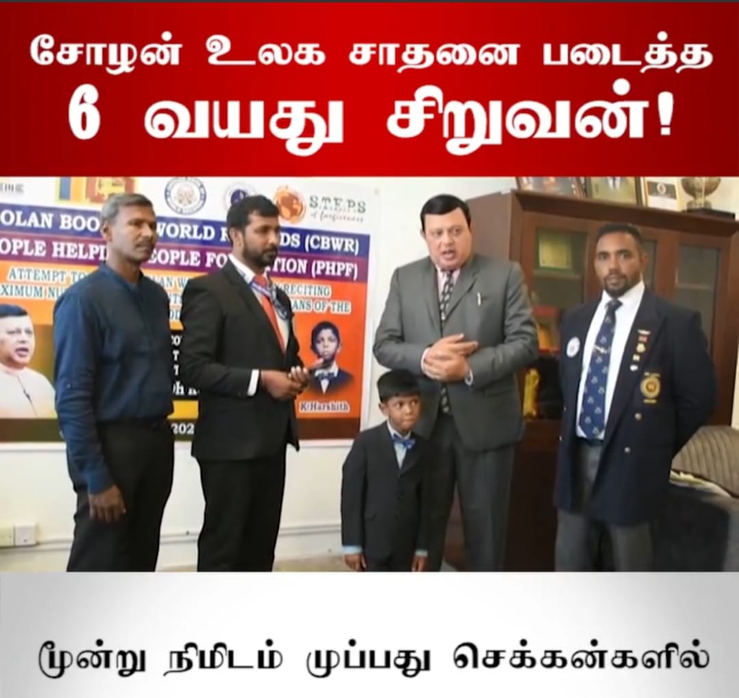 A 6-year-old kid named Harsith, the son of Kalainesan and Lalithambikai, residing at Lover's Leap, Nuwara Eliya, and studying at Holy Trinity College, attempted to set a Cholan world record in the presence of State Minister of Education, Arvind Kumar.