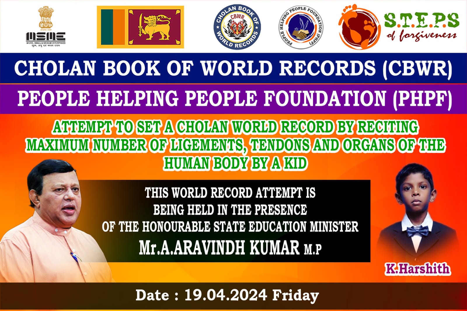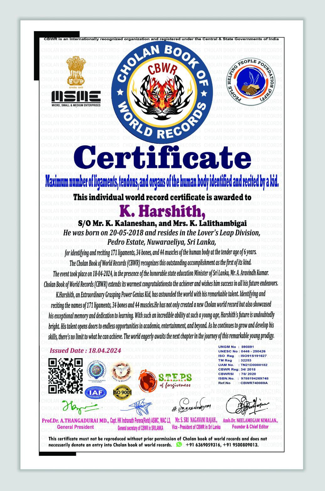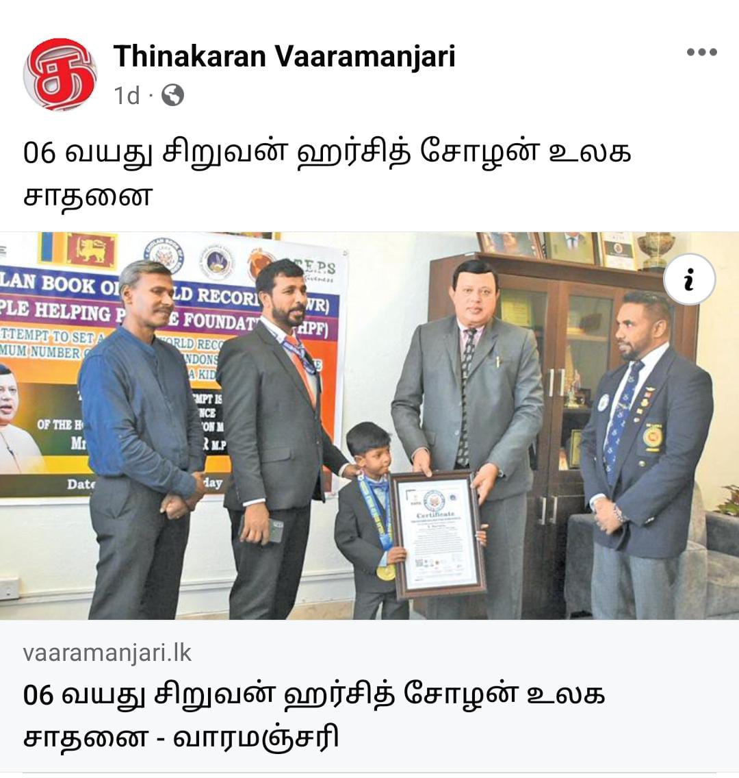A 6-year-old kid named Harsith, the son of Kalainesan and Lalithambikai, residing at Lover's Leap, Nuwara Eliya, and studying at Holy Trinity College, attempted to set a Cholan world record in the presence of State Minister of Education, Arvind Kumar.