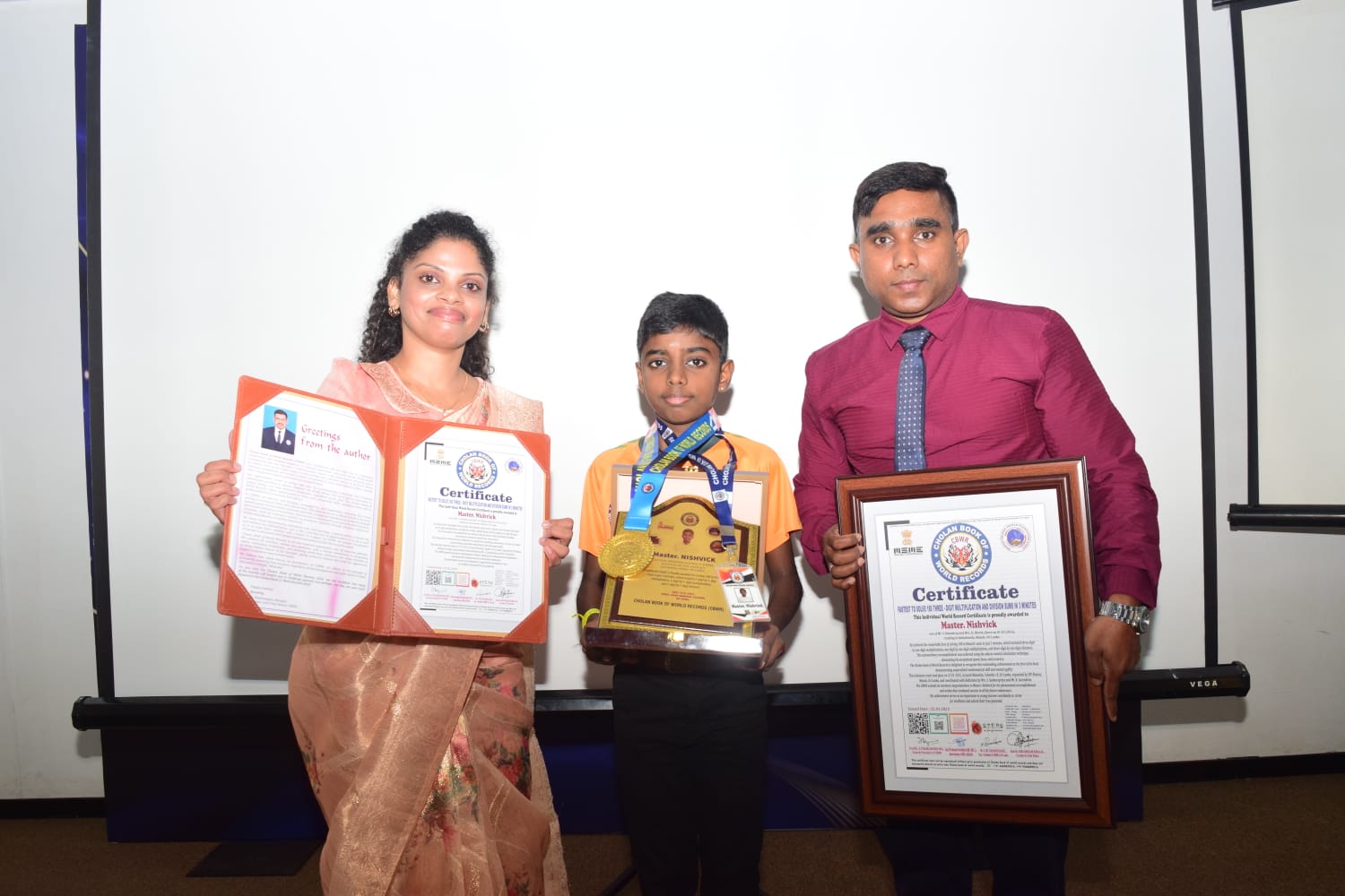 This world record certificate is proudly awarded to Master Nishvick, son of Mr. Y. Dineshraj and Mrs. D. Sherin, born on 01-03-2016, residing in Kaludewela, Matale, Sri Lanka.